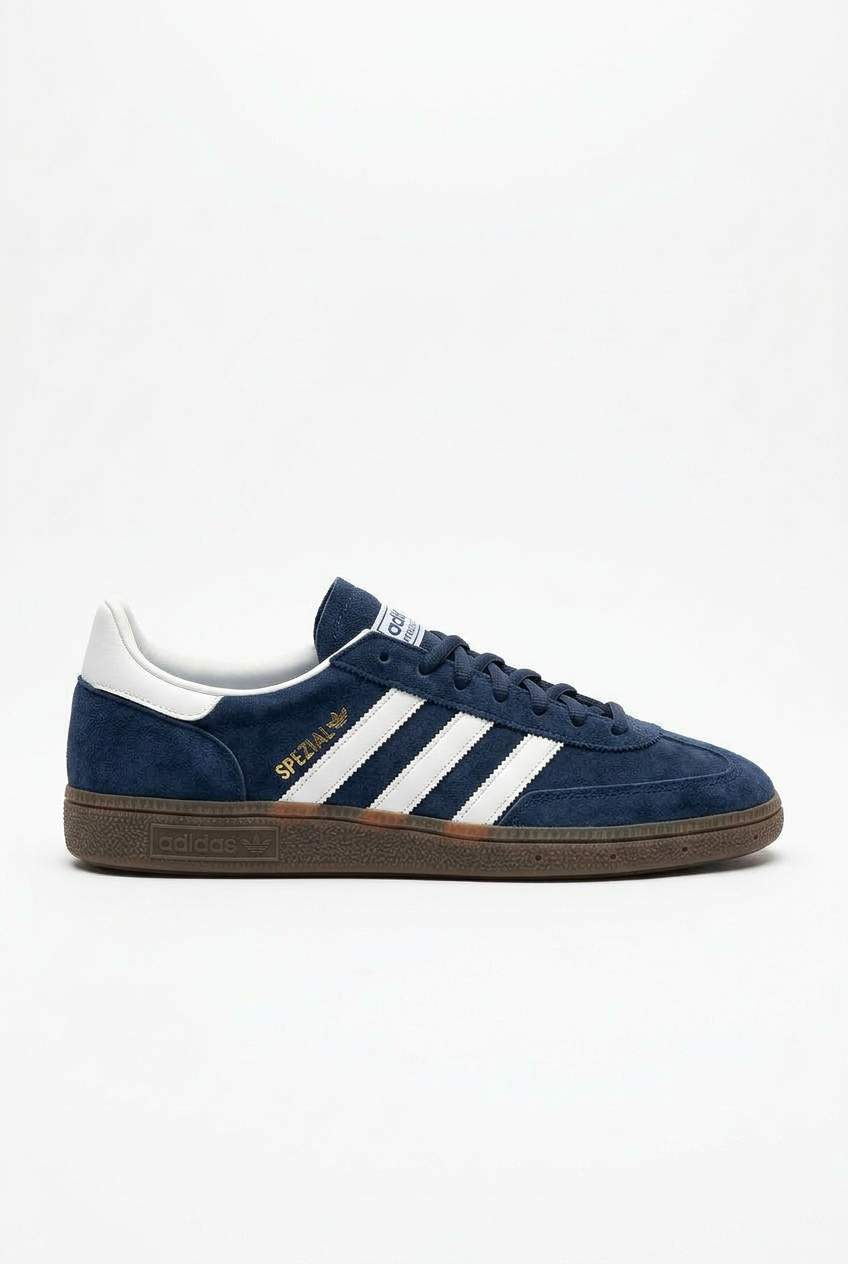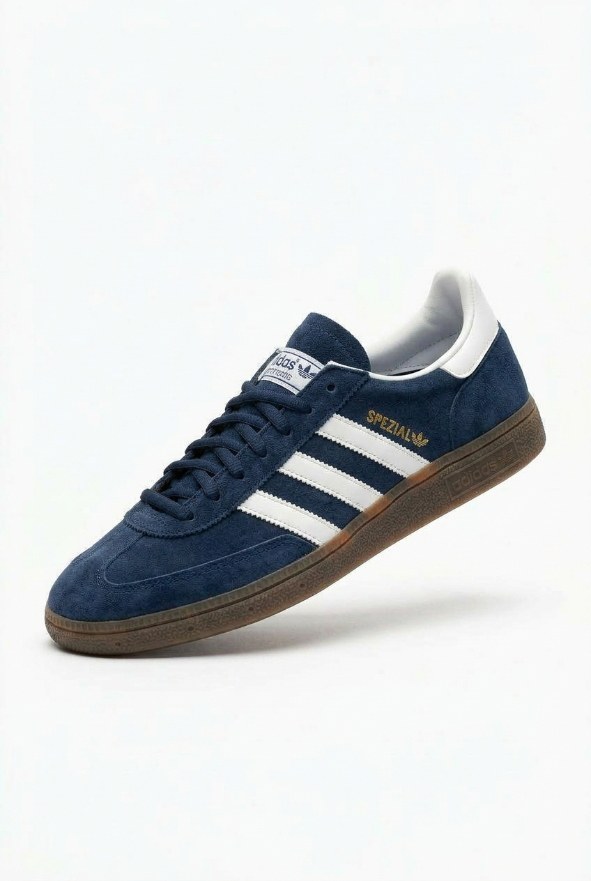 Кросівки Adidas Spezial у глибокому темно-синьому відтінку — це поєднання стриманого стилю та перевіреної класики. Верх із м’якої замші виглядає благородно та додає образу елегантності, а контрастні білі смужки підкреслюють впізнаваний дизайн.