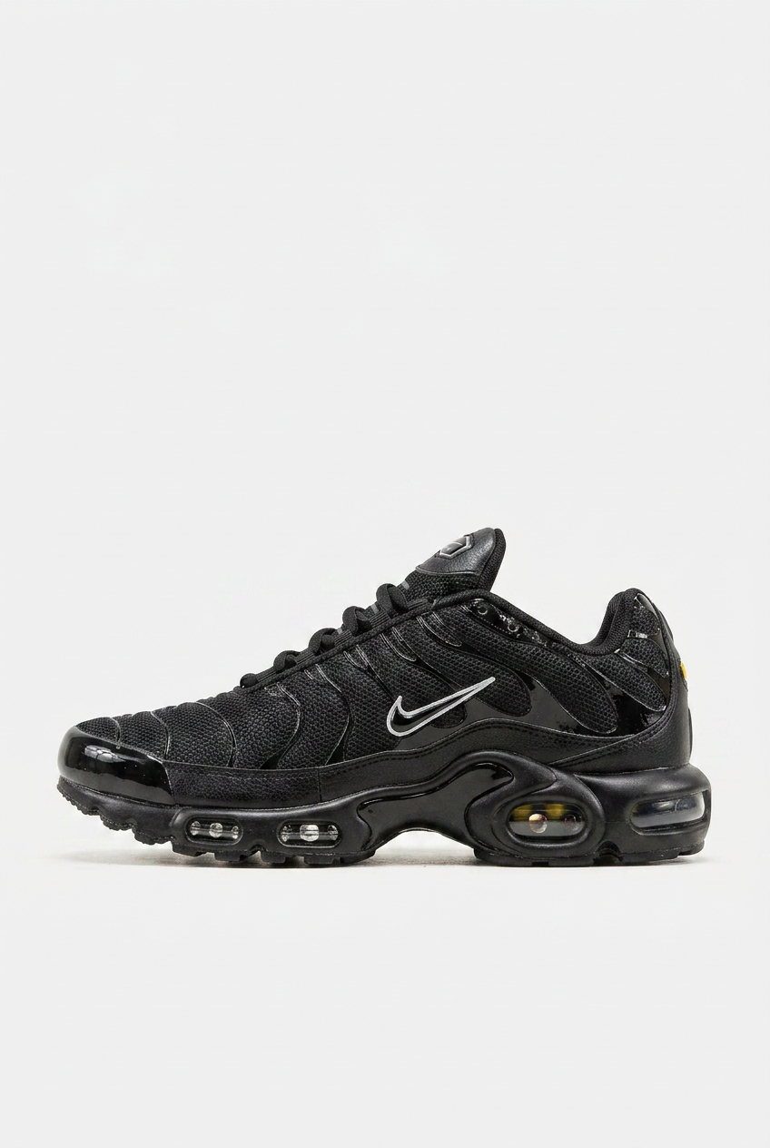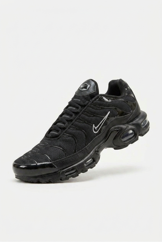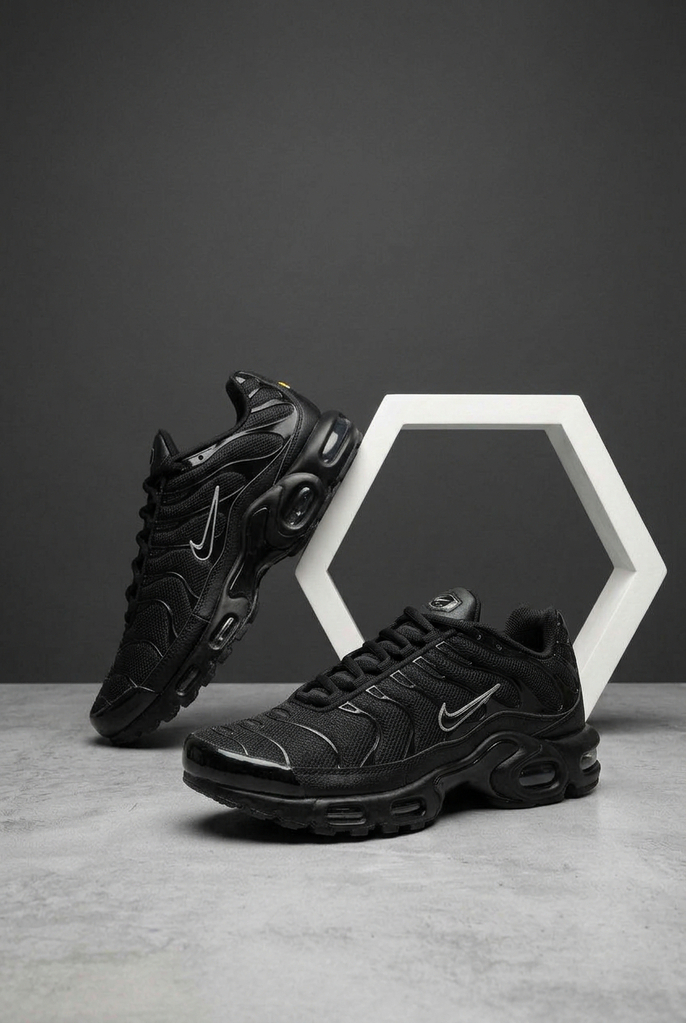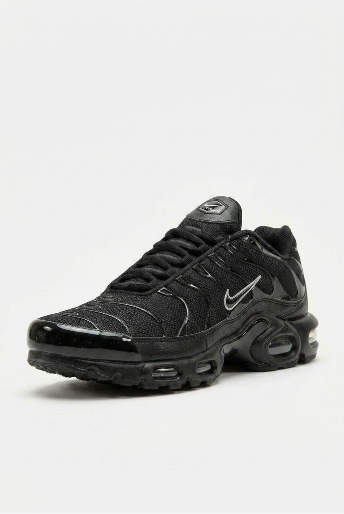 Кросівки Nike Air Max Plus у повністю чорному виконанні — це поєднання агресивного дизайну та сучасних технологій комфорту. Верх із сітки з хвилястими накладками створює динамічний вигляд і забезпечує хорошу вентиляцію.