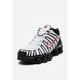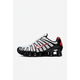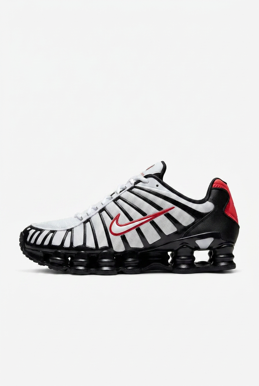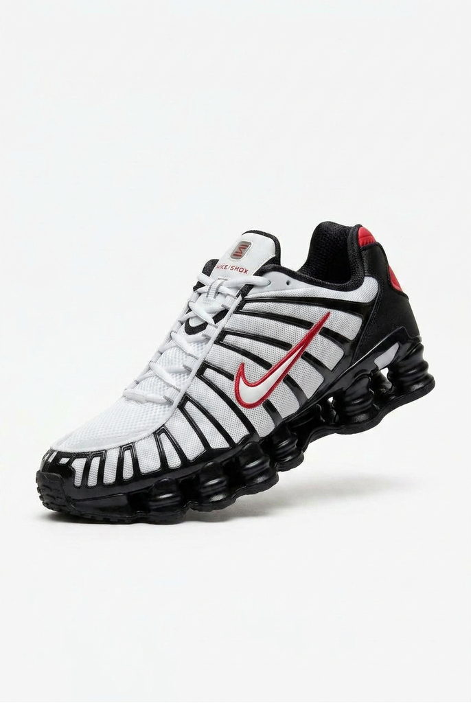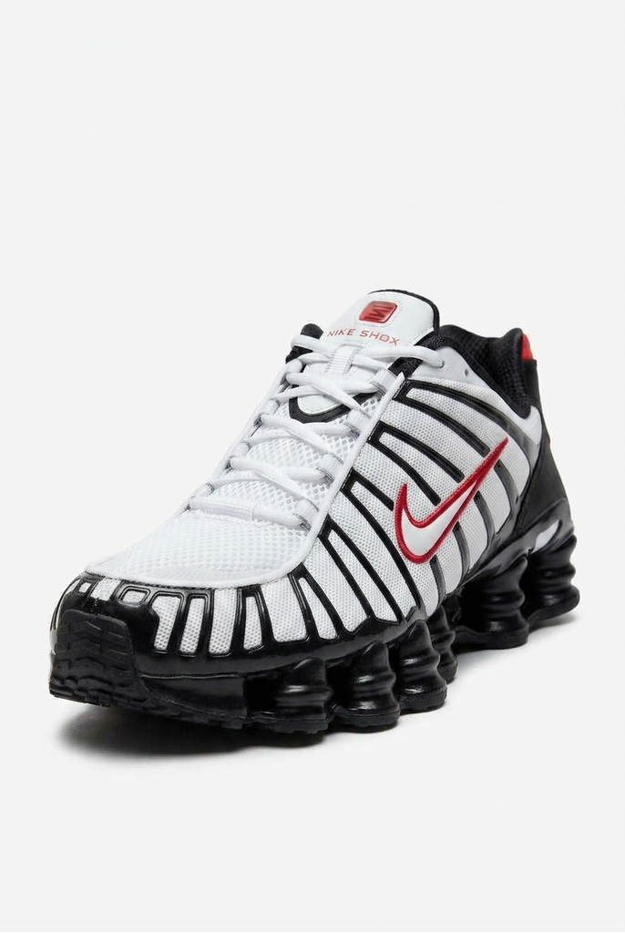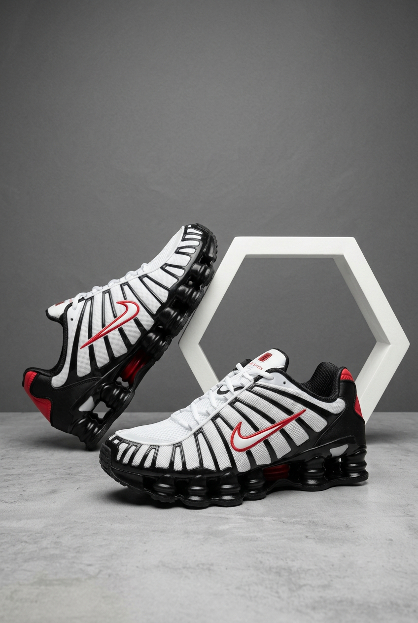 Кросівки Nike Shox у біло-чорно-червоному виконанні — це яскраве поєднання спортивного стилю та технологічного дизайну. Контрастні лінії та акцентний логотип створюють динамічний вигляд, який привертає увагу з першого погляду.